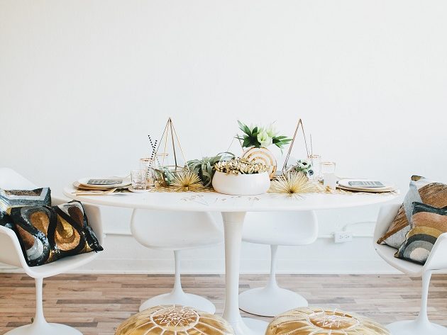 Son mejores las reuniones en casa. Si tuviera una casa grande con suficiente espacio para albergar a varias personas, sería genial montar una pequeña fiesta casera con estética y detalles como los de la inspiración de hoy: decoración ecléctica con un punto boho, cubertería dorada, vajilla vintage, crackers llenos de confetti y sorpresas…